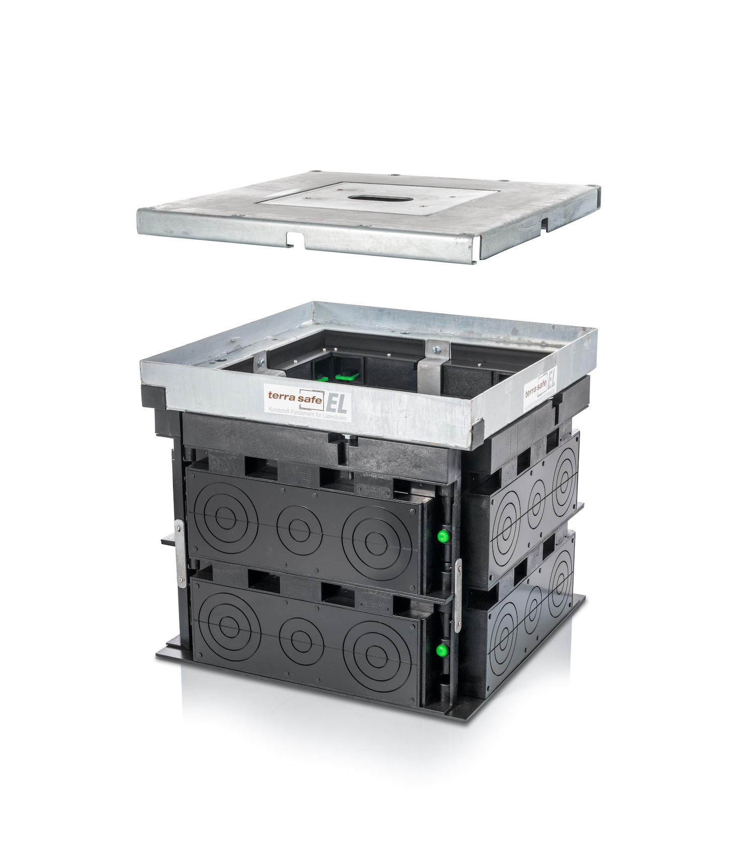 The plastic foundation TerraSafe-EL provides a solid base for AC and DC electric vehicle charging stations. Different interchangeable covers with pre-fabricated fixing points for many charging stations means maximum flexibility, also in case of a later replacement. Charging stations can be replaced without further civil engineering work. Due to its low weight the TerraSafe-EL is an ideal alternative to conventional concrete foundations. The variable structure and prefabricated cable entries enable a time-saving installation. The TerraSafe-EL plastic foundation is made of recyclable polypropylene, is compatible with groundwater and resistant to petroleum oil.