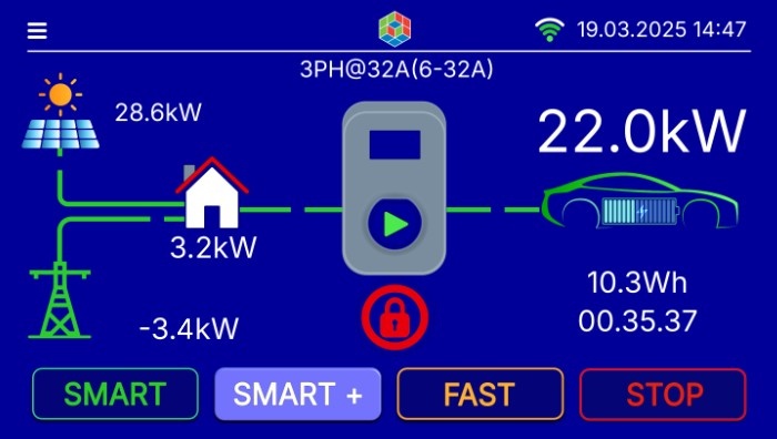 You can connect your charger to the internet via WiFi and remotely manage it through the web (no app installation required — works with any web browser). You can monitor current charging power, household consumption, and production from renewable sources.