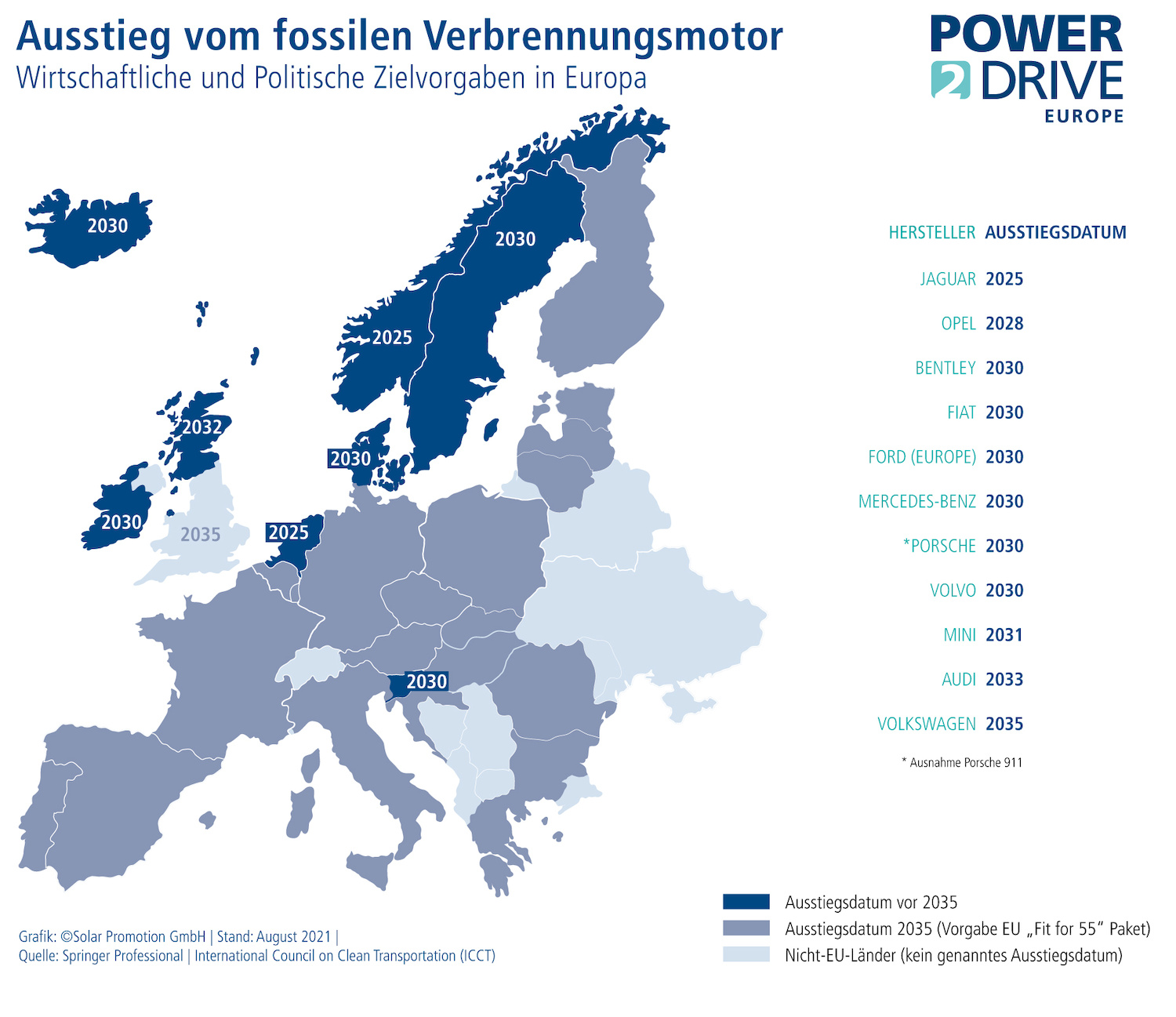 Die meisten Autohersteller haben ihre Unternehmensstrategien angepasst und bereits selbst den Abschied vom klassischen Verbrennungsmotor angekündigt (siehe Grafik). So nennt Volkswagen 2035 als spätestes Ausstiegsdatum, Fiat und Ford wollen spätestens 2030 so weit sein. Mercedes-Benz hat kürzlich angekündigt, bis 2030 „überall dort, wo es die Marktbedingungen zulassen“, nur noch batterieelektrische Automobile anzubieten. Opel will in Europa schon 2028 zur reinen E-Marke werden. Die Liste lässt sich fortsetzen: Bei Volvo (2030), Jaguar (2025) und Mini (2031) steht ebenfalls schon ein Verfallsdatum auf den Verbrennern. Die Branche ist es also, die vorausgeht und den Ländern und ihren Regierungen mit dem jeweiligen Ausstiegsdatum Orientierung bietet. Andere Autohersteller setzen von vornherein auf E-Autos, allen voran Tesla, aber auch Polestar (Joint-Venture von Volvo und Geely) und etliche neue Hersteller. Und dabei profitiert die Wirtschaft auch von weiteren Symbiosen, denn sektorübergreifenden Innovationen zur umweltfreundlichen Mobilität, neue Mobilitätskonzepte und die Einbindung der E-Fahrzeuge als mobile Batteriespeicher ins nachhaltige Energiesystem (Vehicle2Grid) stellen für sie, wie auch für die Nutzer und Gesellschaft einen Mehrwert dar.