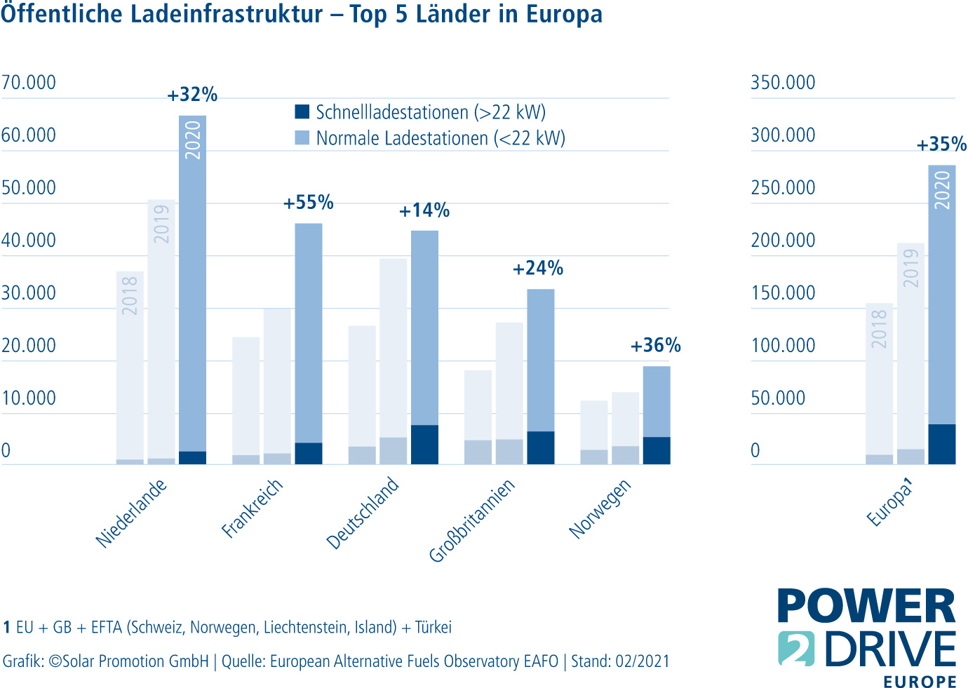 München/Pforzheim, 04. März 2021 – Die öffentliche Ladeinfrastruktur in Europa wächst weiterhin rasant – 2020 um 35 Prozent im Vergleich zum Vorjahr. Unter den Top 5 Ländern sind die Niederlande mit mehr als 66.600 öffentlichen Ladesäulen Spitzenreiter. Frankreich überholt mit über 46.000 installierten Ladepunkten Deutschland (2020: rund 44.700), gefolgt von Großbritannien. Das geht aus Daten des European Alternative Fuels Observatory (EAFO) hervor. Auch private Wallboxen sind gefragter denn je, sodass die Förderung in Deutschland zum zweiten Mal innerhalb kürzester Zeit aufgestockt wurde. Die führenden Ladeinfrastruktur-Anbieter präsentieren sich auf der Power2Drive Europe, die vom 21. bis 23. Juli 2021 auf der Messe München im Rahmen von The smarter E Europe stattfindet.