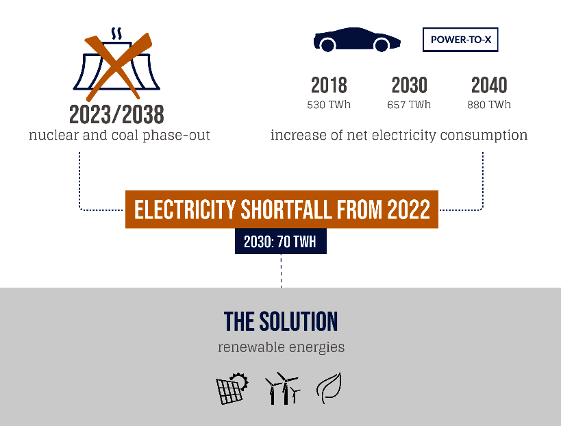 With the shutdown of the last active nuclear power plants and the already decided coal phase-out, half of the current generation capacities in the electricity market must be replaced in the medium term. A massive decline in electricity generation will, according to the experts' calculations, coincide with the growing demand for electricity in Germany. Despite an increase in energy efficiency, this will increase significantly as a result of increasing electrification of the mobility and heating sector as well as the use of hydrogen or synthetic gas in the context of Power-to-X solutions.